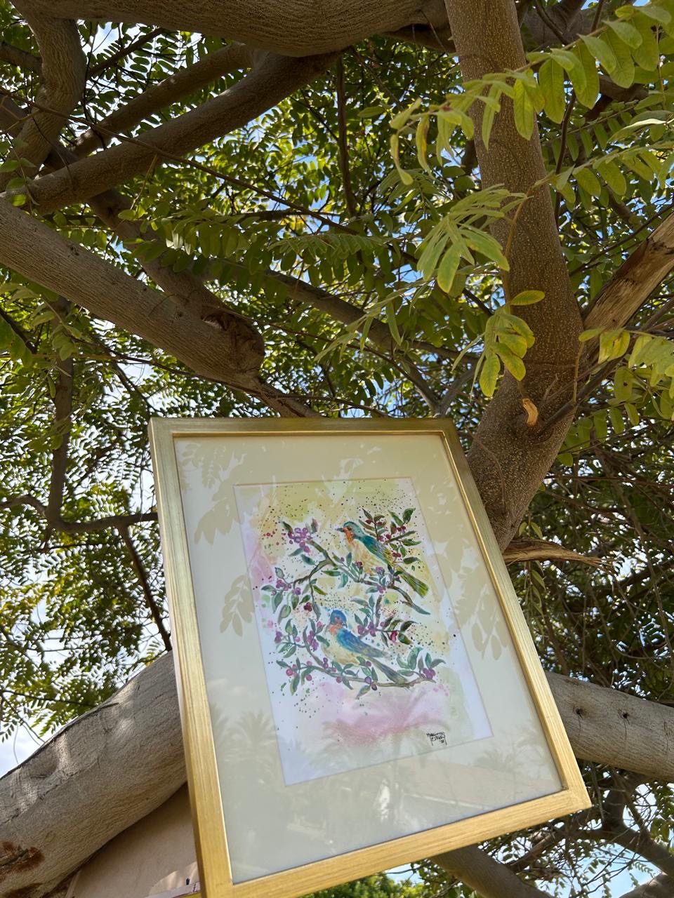 Watercolor portrayal of a hand-painted bird framed in a handmade wooden frame covered in gold leaves.