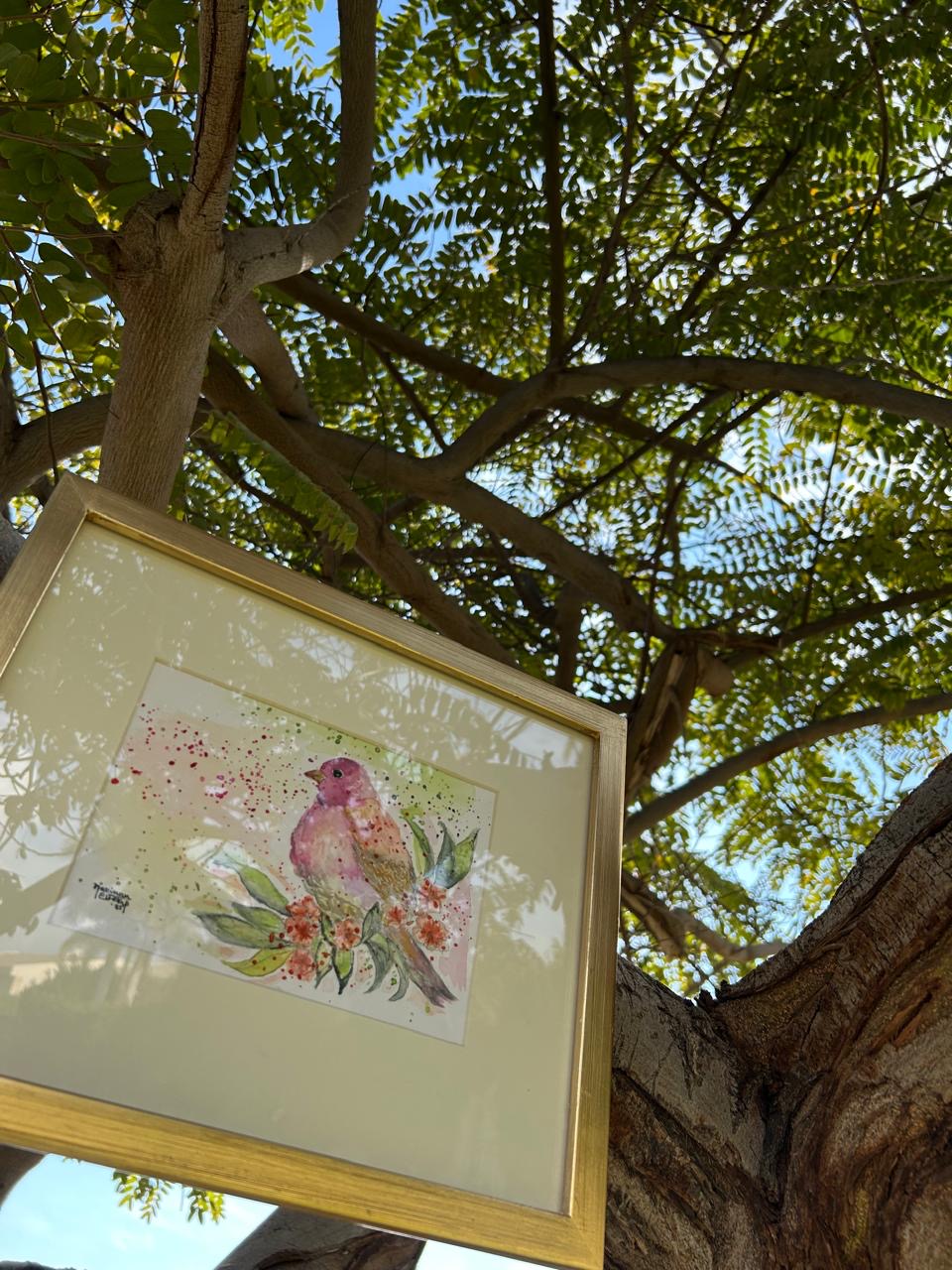 Watercolor portrayal of a hand-painted bird framed in a handmade wooden frame covered in gold leaves.