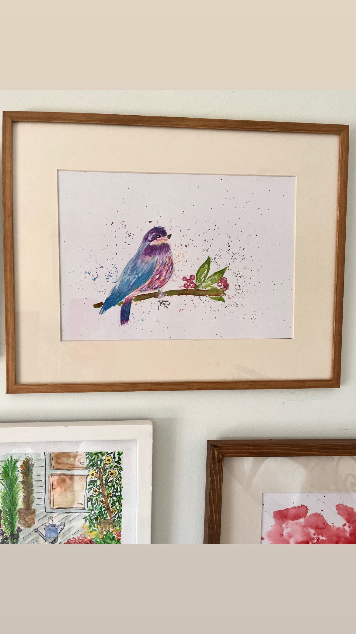 Watercolor portrayal of a hand-painted bird framed in a handmade wooden frame