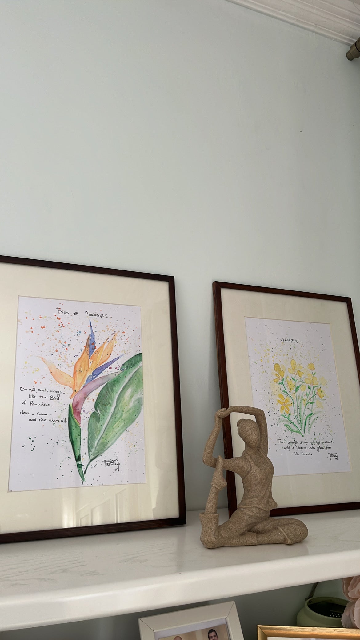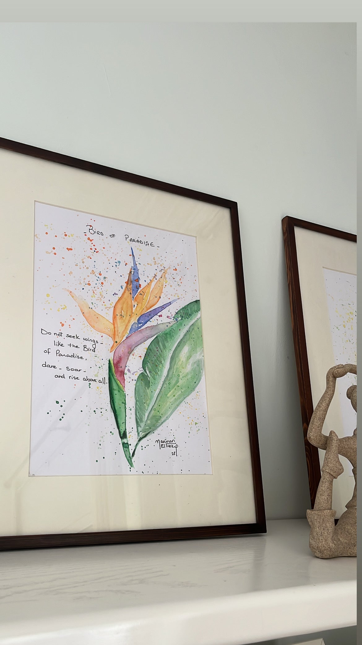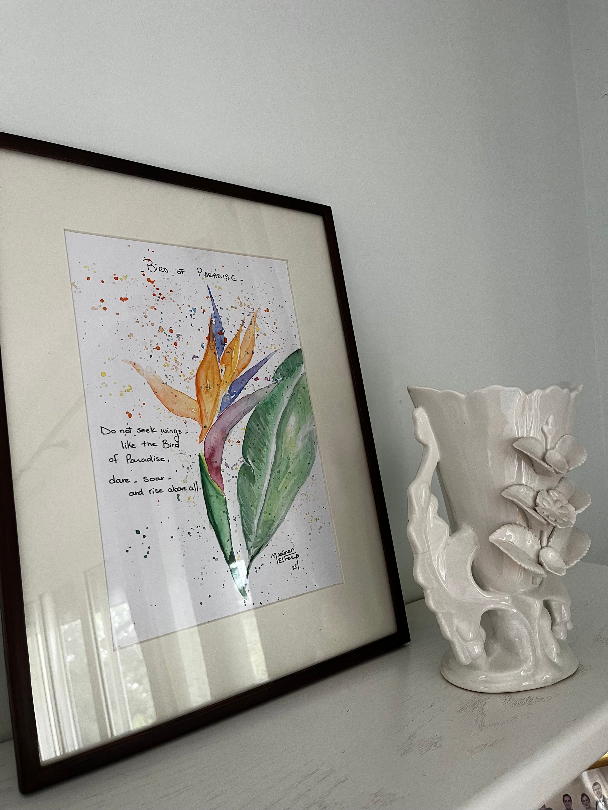 Inspired by the Bird of Paradise, a flower that stands tall and unfurls with striking elegance, this delicate painting symbolizes the courage to rise, soar, and finding freedom from within.