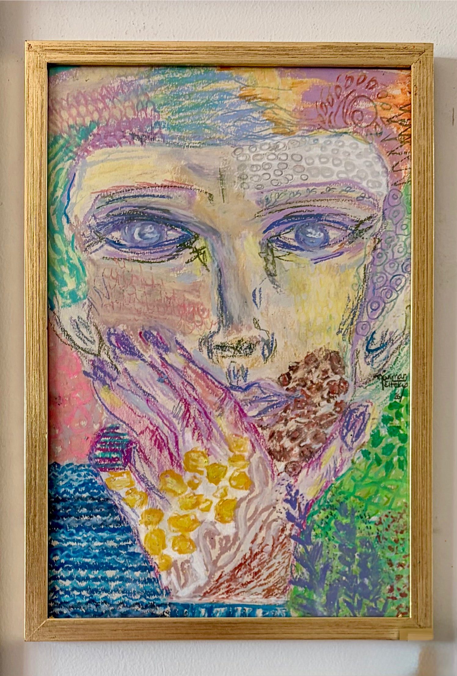 A contemplative oil pastel piece from the Them collection, exploring absence and inner distance.