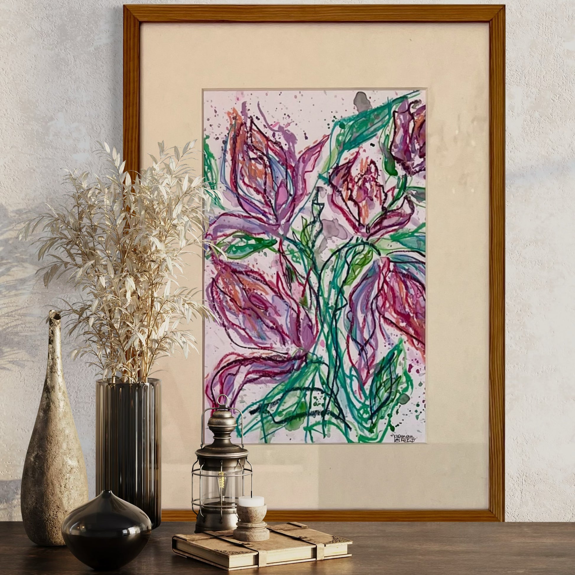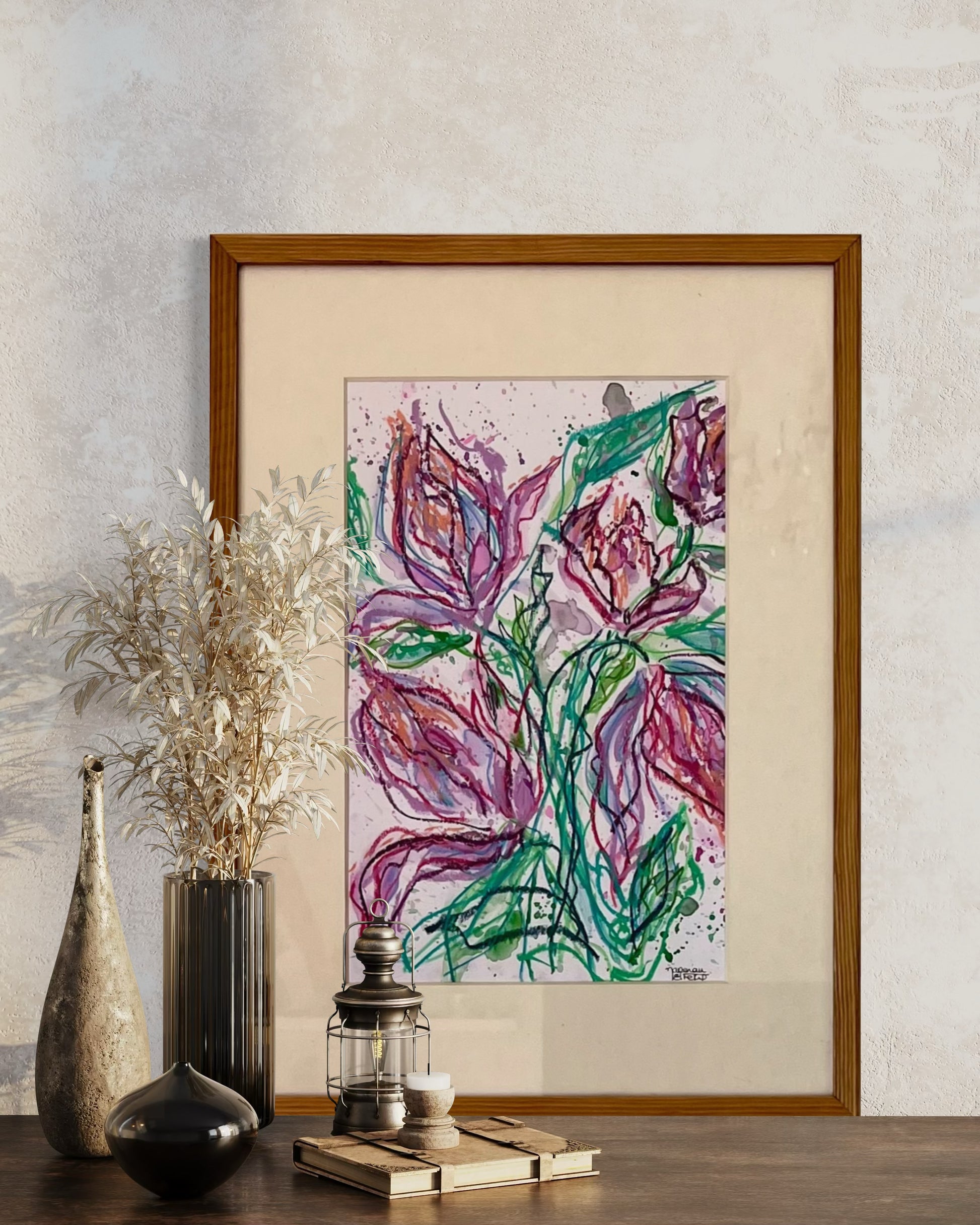 Floral Mess is an expressive mixed-media painting that celebrates imperfection as a form of beauty. Unrestrained gestures, overlapping lines, and freely flowing colour allow the flowers to emerge without order or correction. The piece embraces movement, emotion, and spontaneity. A reminder that growth is often untidy, yet deeply alive.