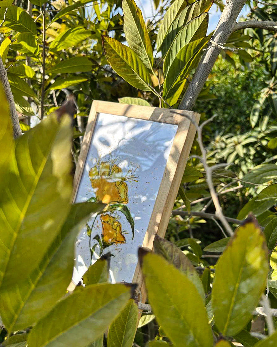 Watercolor and ink portrayal of hand-painted Yellow bells flowers framed in a handmade wooden frame.