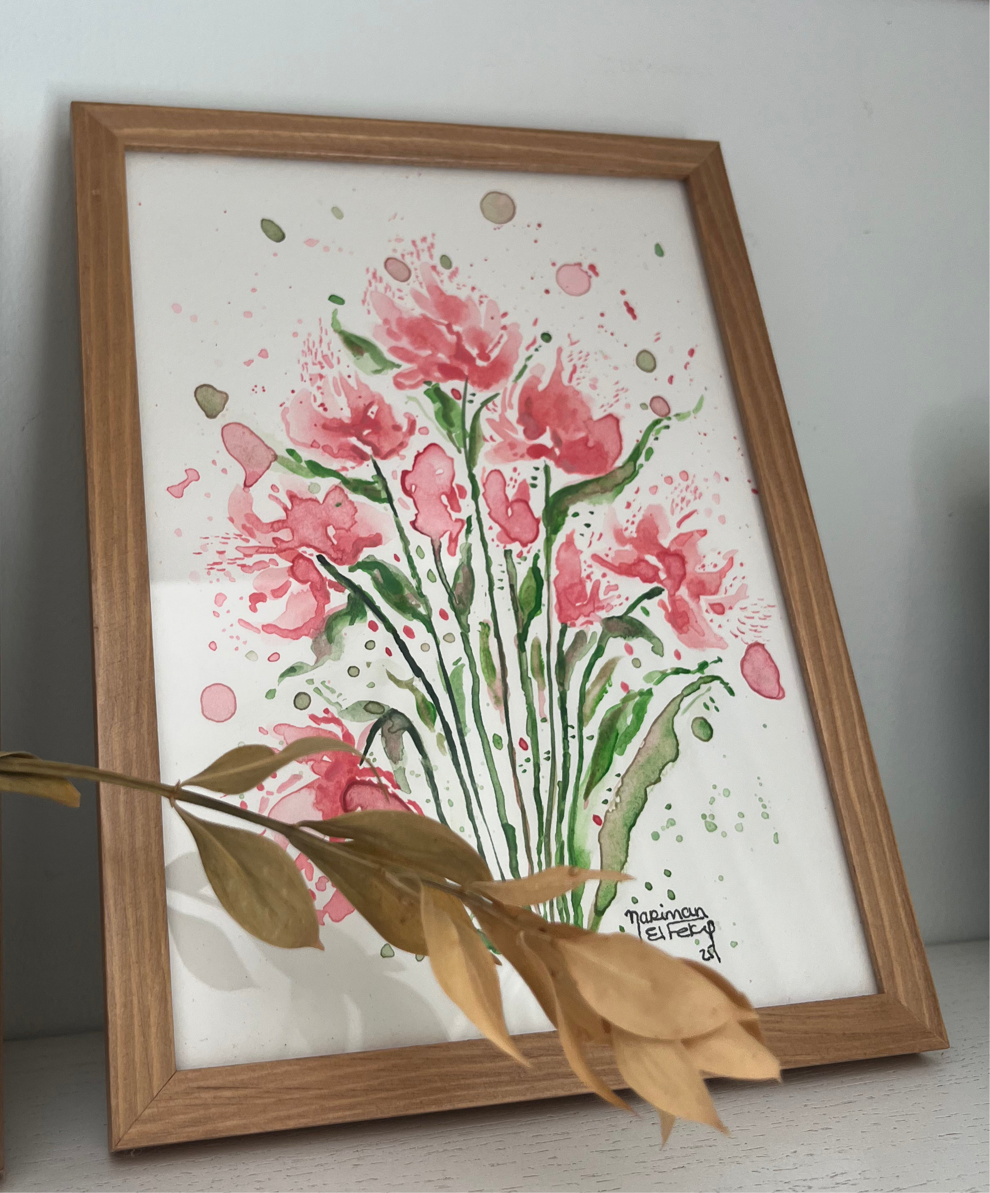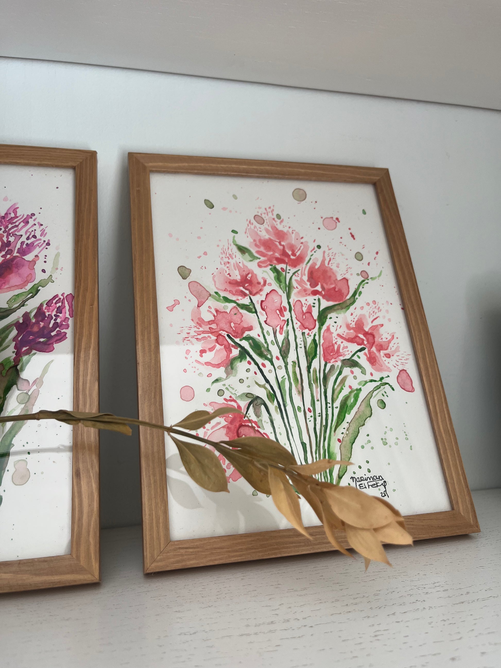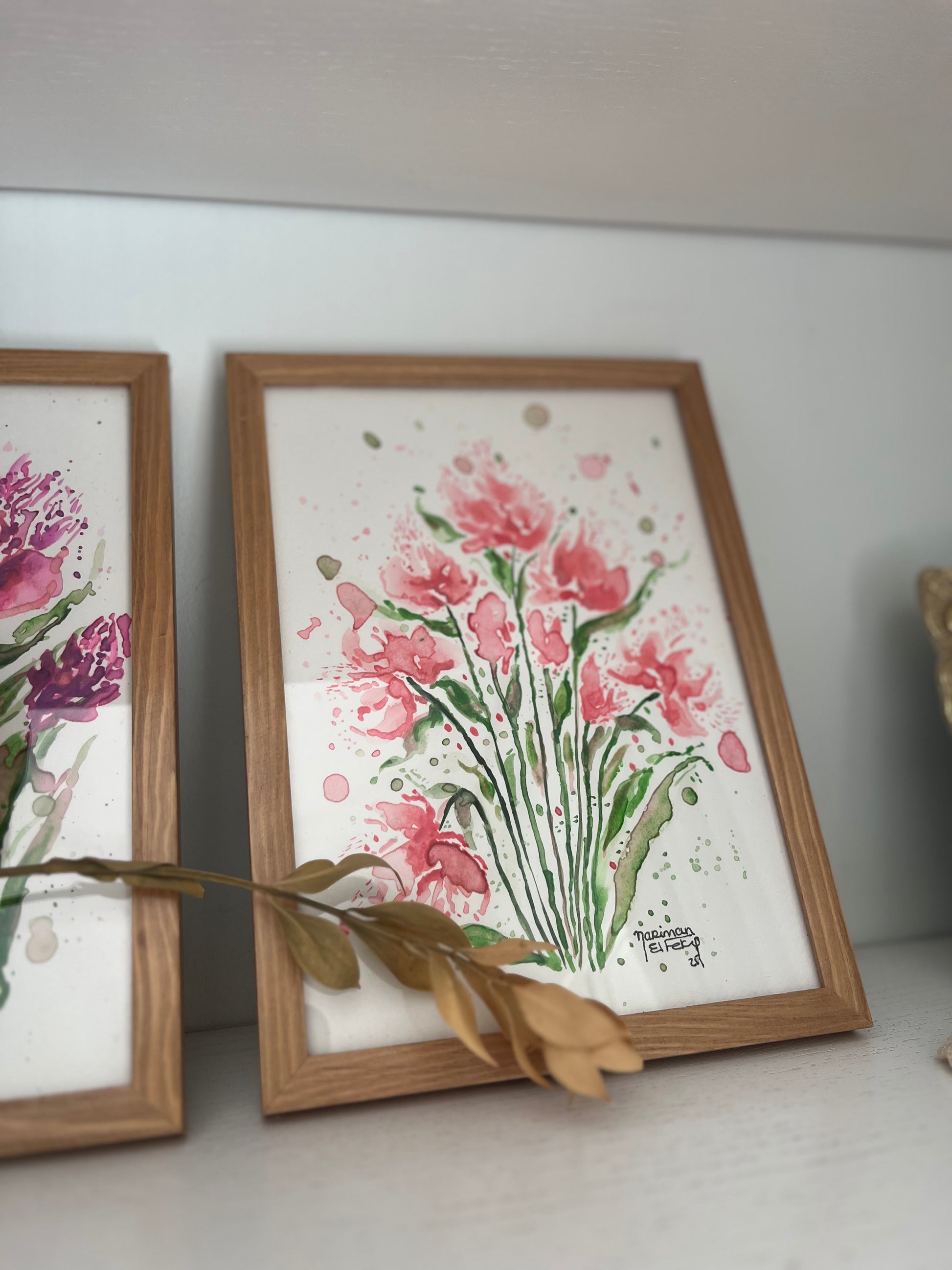 a playful watercolor painting radiating fresh, sunlit hues of pink and pale orange. Framed in handmade wood.