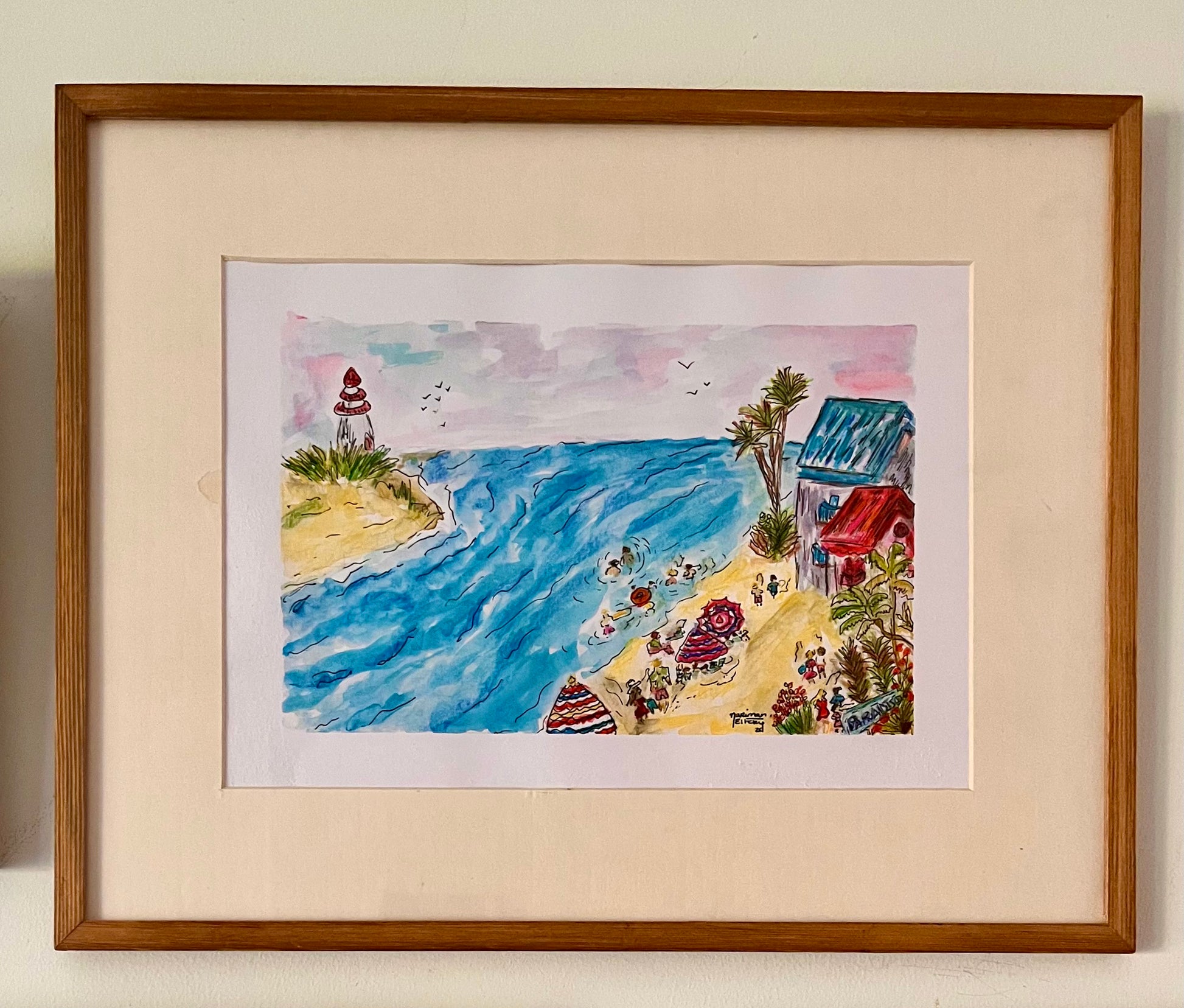 A playful watercolor and ink piece capturing a dreamy coastal escape, where sun-soaked sands, seaside cottages, and a distant lighthouse come alive with movement, joy, and color in a hand-made wooden frame.