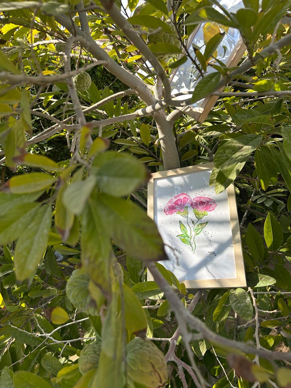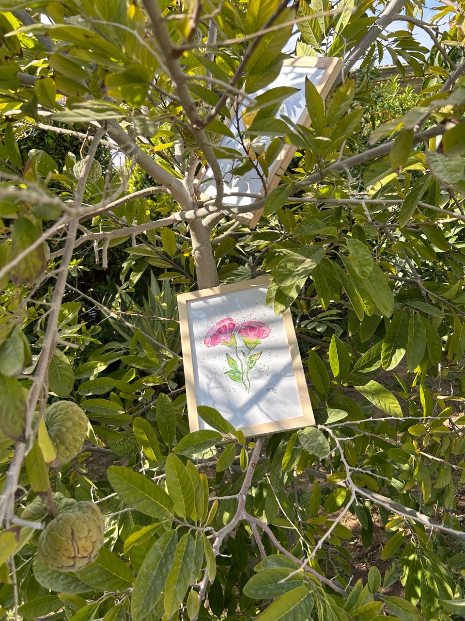 Watercolor portrayal of a hand-painted Carnation flower framed in a handmade wooden frame.