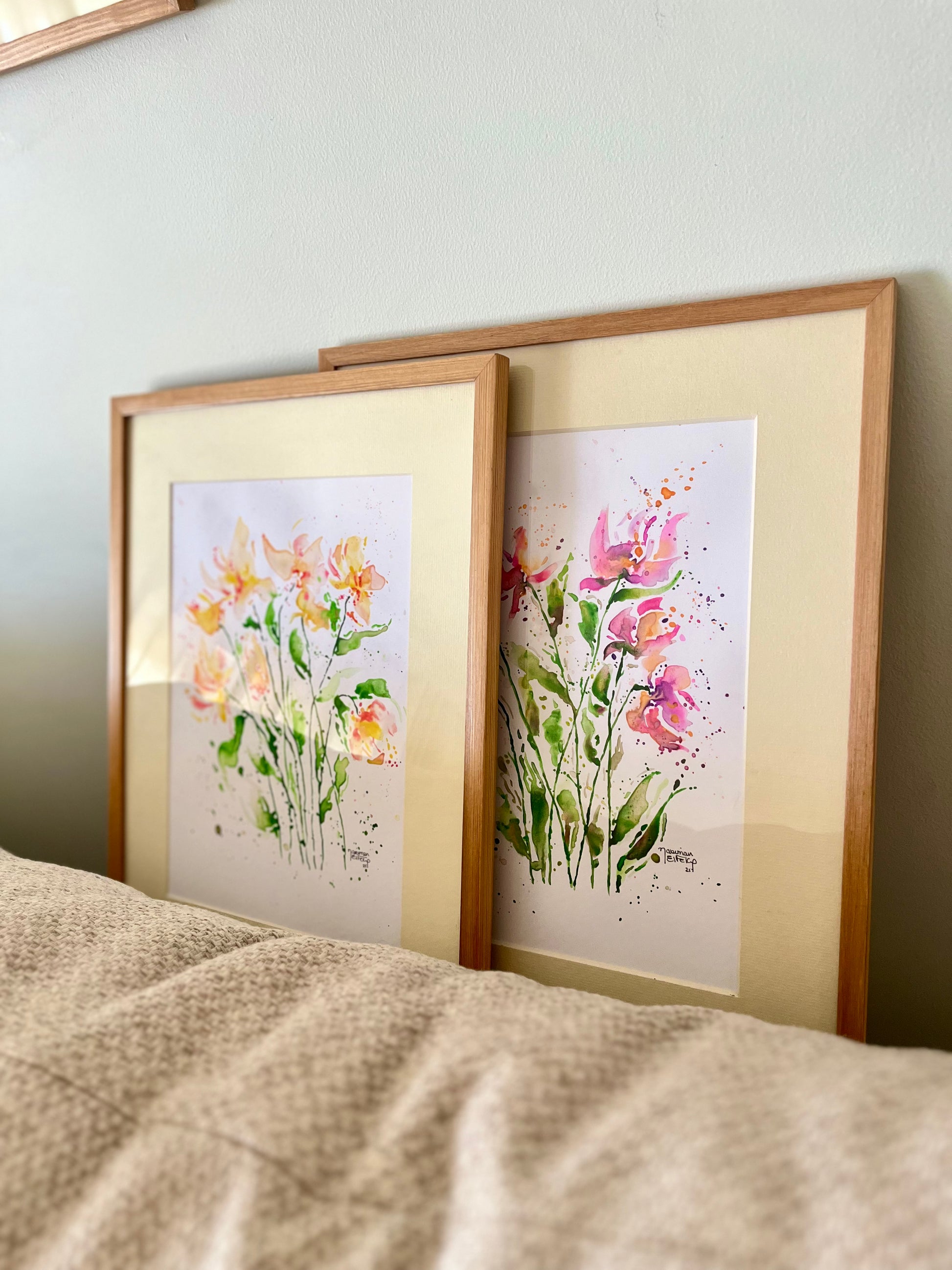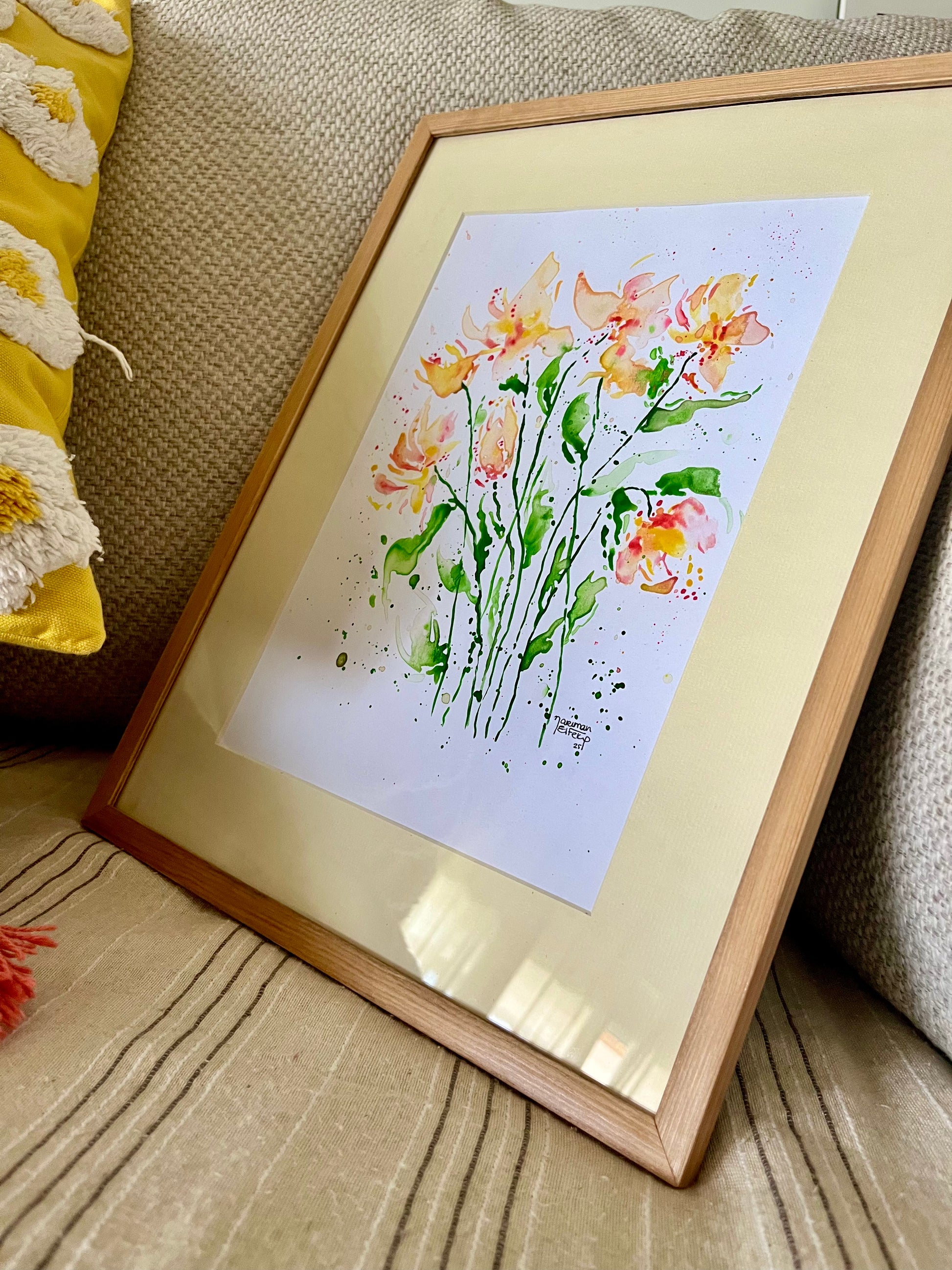 Watercolor portrayal of hand-painted abstract yellow Champaca flower booming with fiery tones, bursting with colour to brighten your space and fill it with meaning - framed in handcrafted wood.